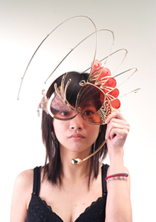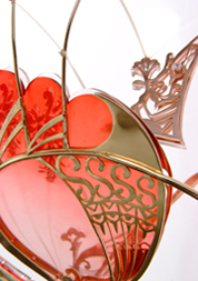 壓克力切割後配合金屬弧度熱塑,並熱染(紅色)。鏡框紅銅鍍18k,鏡架鍍玫瑰K。