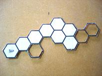 將排好的六角形圖案貼在金屬板片上,再加以鏤空