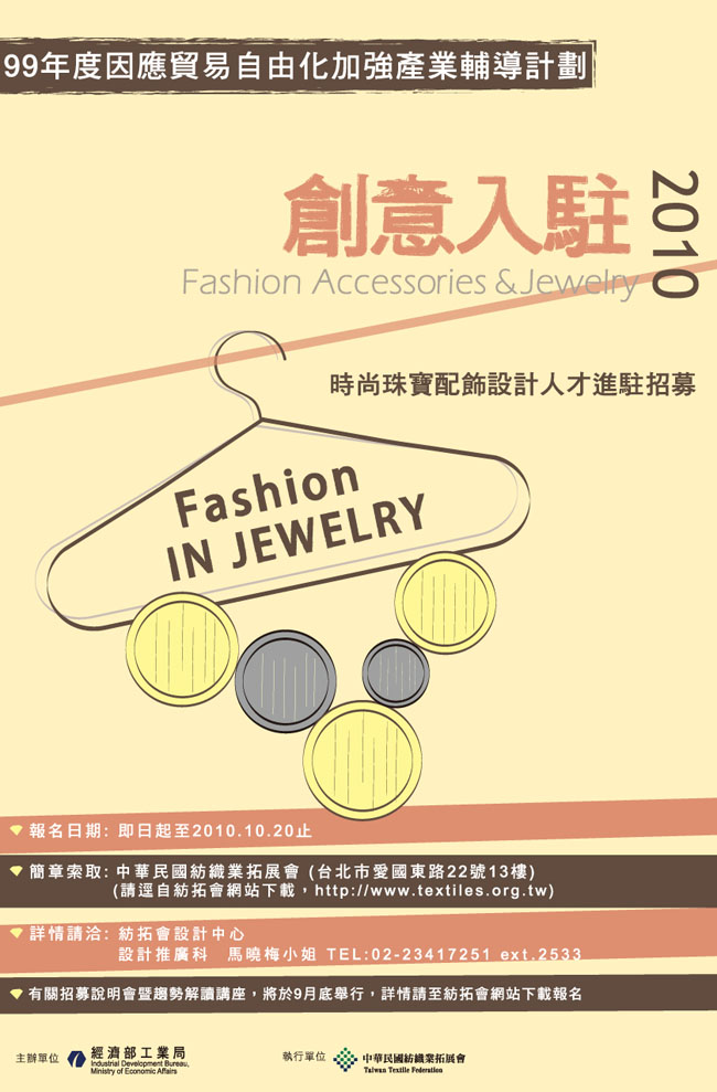 「經濟部工業局」為推動珠寶配飾創意設計與技術開發人才的養成,培育新一代珠寶配飾設計人才設計與品牌行銷能力,由「中華民國紡織業拓展會」執行「時尚珠寶配飾創新中心」計畫,將甄選優秀設計人才進駐「時尚珠寶配飾創新中心」,強化設計行銷、商品企劃及品牌營運之能量,期強化國內珠寶配飾設計人才實力,凝聚珠寶配飾創作者的創意與經驗,集結服飾與金工設計資源達到產業異業結盟,以提升珠寶配飾產業國際競爭力。
